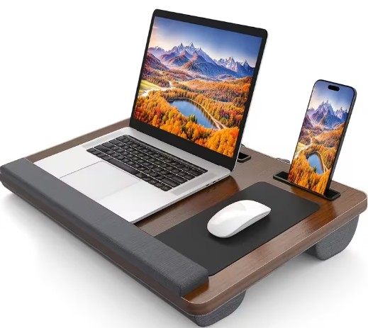 Mesa de secretária portátil versátil para adultos - Grande, mesa de cama dobrável em madeira com apoio para pulsos, almofada para rato, compartimentos para tablet e telemóvel, e pega para fácil transporte - Ideal para escritório em casa, estudo ou dormitório, organizador de secretária e gaveta para arrumação doméstica